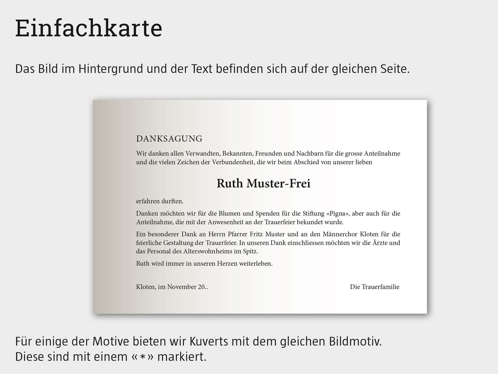 Gerne können Sie uns ein Foto zustellen, und wir werden es integrieren. Hätten Sie lieber ein eigenes Bild-Motiv? Wählen Sie das Motiv «Eigenes Motiv», und wir gestalten die Karte gemäss Ihren Wünschen.