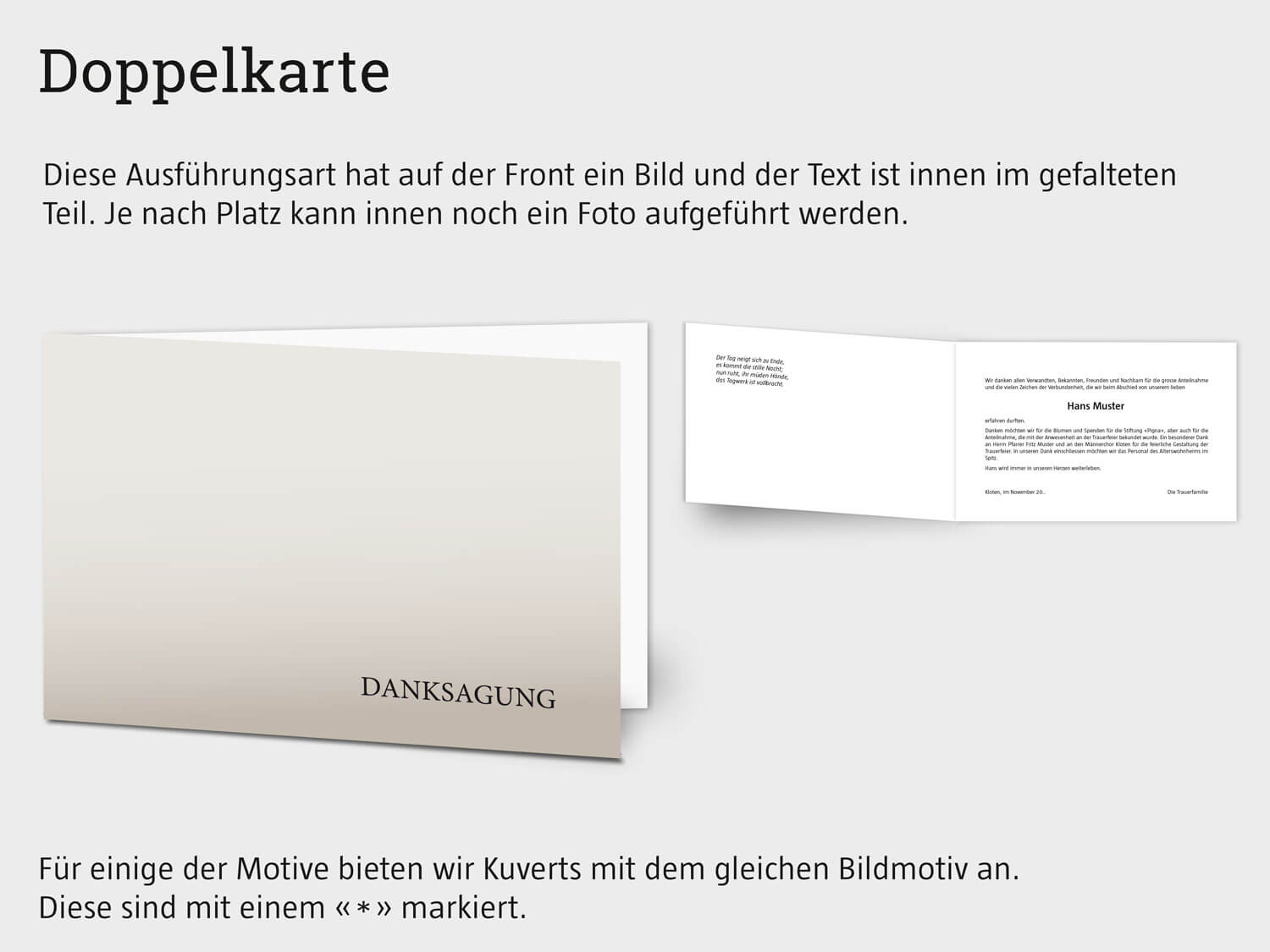 Wählen und bestellen Sie aus einer grossen Auswahl eine Danksagung bzw. Dankeskarte mit passenden Kuverts – gerne gestalten, drucken und versenden wir nach Ihren Wünschen. Während dem Bestellprozess werden Sie durch alle Teile geführt und erhalten auch Textbeispiele, die bei der Formulierung der Dankesworte helfen.
